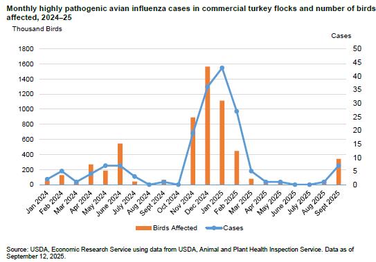 Extensive depopulation was carried out as a result of HPAI through the fourth quarter of 2024 and continuing in January and February 2025 (31 million), but with lower intensity in March (0.2 million) and April (1.0 million) and a single large complex in Arizona during May (3.8 million).  Losses reemerged during late September in a caged-bird complex in Wisconsin (3.1 million hens and +250,000 pullets).