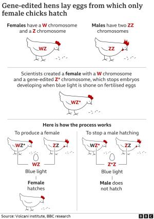 The technique involves application of CRISPR-CAS9 to a sequence of the z chromosome, a co-determinant of gender in chickens. Males carry the zz chromosome and females are zw. The construct developed by NRS with intended commercialization by NextHen requires insertion of promoters adjacent to the 5’HA end of the sequence and insertion of a lethal gene adjacent to the 3’HA end. Lethality is activated by exposure to light of a highly specific blue wavelength. The construct must be inserted into the pure line C strain to pass the altered z chromosome to the grandparent C-line hen. The female of the parent level (CD) will therefore carry the modified z chromosome. The male line AB parents are normal in all respects. At the parent level CD females carrying the modified z chromosome mated to AB males produce pullet chicks with a normal z and w chromosomes. Eggs from the mating are subjected to blue light that is optogenic in its action on the z chromosome carrying the lethal gene. This results in inhibition of development of male (zz) embryos since they carry the lethal trait on the z chromosome acquired from the CD parent female (zw). Female embryos carry an unaltered z chromosome and therefore hatch normally.