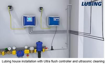 For new installations with clean water lines, Lubing offers an ultrasonic cleaning module. This option prevents the accumulation of biofilm. The ultrasonic transducer is mounted in the incoming water line. The transducer generates high frequency sound waves that generate a stream of bubbles. Resulting cavitation dislodges mineral and biologic deposits on the interior surface of water lines. The system is both efficient and environmentally friendly since it obviates addition of chemicals. The Lubing transducer can effectively operate up t0 1,000 feet of piping.